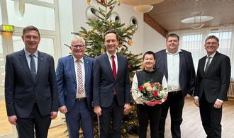 Im Bild, von links: Bürgermeister Jens Machnow, Ewald Vögler, Landrat Florian Töpper, Petra Jakob, Bürgermeister Peter Gehring und Bürgermeister Ulrich Werner
