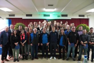 Und auch die sportlichen Erfolge wurden wieder gewürdigt und so versammelten sich auf der Bühne viele Meisterinnen und Meister: Die Fußballer der JFG AltmainSchorn und die Tennisherren der DJK Hirschfeld, sowie die Heidenfelder Korbballfrauen der ersten, zweiten und dritten Mannschaft mit Trainer Ben Stacey und die Korbballerinnen der DJK Hirschfeld mit Trainerin Franziska Wenzel, dazu die Korbball-Trainerinnen der Spielgemeinschaft Heidenfeld/Hirschfeld Finja Stock für die J12 und Nicole Mäuser (J9).
