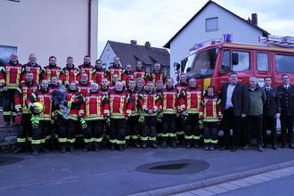 Die Fotos zeigen die Ehrung, sowie die drei neu ausgestatteten Wehren mit ihren Kommandanten - für Röthlein Harald Marschall und Dominik Halbig, für Heidenfeld Sandra Kaufmann und Oliver Kresser und für Hirschfeld Andreas Dittmann und Thorsten Dotzel, sowie die Ehrenkommandanten Werner Volland und Georg Dittmann in der neuen Einsatzkleidung, außerdem Kreisbrandinspektor Florian Zippel und Kreisbrandmeister Matthias Hübner von der Kreisbrandinspektion Schweinfurt und die drei Bürgermeister der Großgemeinde:
