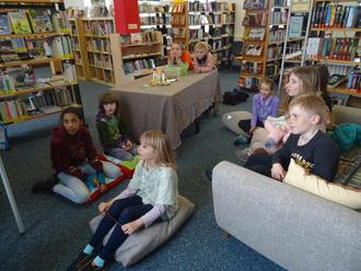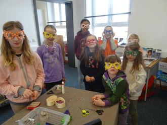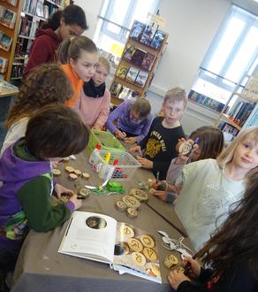 Schulleiterin Alexis las Szenen aus dem dicken Harry Potter Fanbuch vor und dazwischen wurde gebastelt. Die Brille von Luna Lovegood, ein Lesezeichen mit einer Hogwartseule, einen Schnaz (gefiederter Ball für das Quiddich), Untersetzer mit Zauberzeichen und Zauberwort und eine kleine Schatztruhe mit Hogwartsmotiven wurden von den Kindern mit Begeisterung angefertigt.