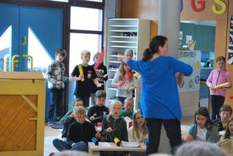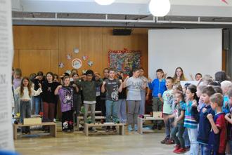 An der Grundschule Röthlein sangen und musizierten am 03.06.2025 alle 142 Schulkinder und Lehrer zusammen in der Aula mehrere Lieder – teils sogar als wirklich schön klingenden Kanon. Begleitet wurde der Gesang von 45 Kindern und Erwachsenen an Instrumenten (Boomwhackers und Klangstäbe), sowie am Klavier und an der Gitarre. Vorher hatten die Lehrenden in den einzelnen Klassen die Lieder eingeübt. Der erfrischende Klang der Kinderstimmen füllte die Aula und förderte bei allen Beteiligten das Gemeinschaftsgefühl – passend zum Schullogo der Grundschule Röthlein („Gemeinsam sind wir stark“).