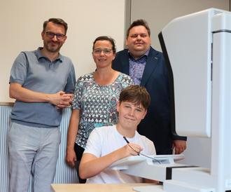 Unser Bild zeigt Geschäftsleiter Simon Göbel, Sachbearbeiterin Carina Friedel und den ersten Bürgermeister Peter Gehring mit Elias Kühlmann bei der Lichtbildaufnahme im Passamt im Zuge der Beantragung eines Personalausweises.