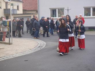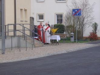Nach dem Segen der Palmwedel wurde zur Kirche gewallt. Die Kirchenmusik begleitete die Gläubigen zur Kirche. Dort wurde mit gewaltigen Schlägen an die Kirchentür um Einlass gebeten.