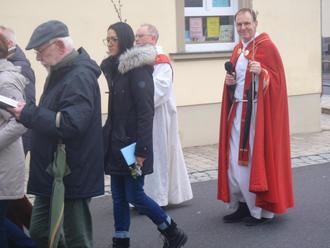 Der Palmsonntagsgottesdienst begann an der St. Jakobus Statue an der Gemeindebibliothek.