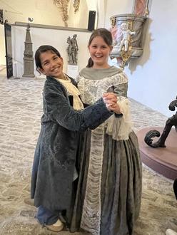 Ein besonderes Highlight war das Anprobieren typischer Kleidungsstücke aus dem Barock: Reifröcke, Perücken und weitere historische Gewänder ließen die Mädchen selbst in die Rolle von Adeligen schlüpfen.