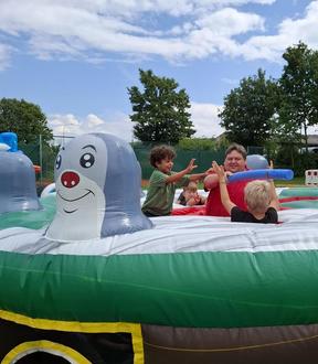Gleich zwei Hüpfburgen luden zum Toben ein, ein überdimensionales Fußball-Dart sorgte für sportlichen Ehrgeiz, und beim Maulwurf-Spiel war blitzschnelles Reagieren gefragt – auch Bürgermeister Peter Gehring ließ sich den Spaß nicht nehmen und versuchte sich mit sichtlicher Begeisterung als „Maulwurfjäger“.