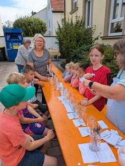 Irene, Georg und Uschi bauten vor der Garage an der Bücherei ihre Schätze auf.