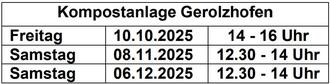 Zusätzlich finden ganzjährig Sammlungen zu bestimmten Zeiten an den Wertstoffhöfen Gerolzhofen bzw. Rothmühle jeweils in der ersten Woche des Monats* (in der Regel von November bis Februar jeweils samstags, von März bis Oktober jeweils donnerstags bzw. freitags) statt.