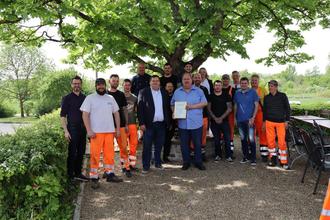 In der Mitte der Jubilar Roland Geis und 1. Bürgermeister Peter Gehring, eingerahmt von seinen Kollegen und der Kollegin aus dem Bauhof, dem 3. Bürgermeister Florian Kress und Geschäftsleiter Simon Göbel