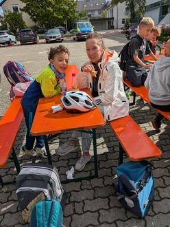 Mit dem Fahrrad und mit Helm ausgerüstet fuhren die Kinder in Begleitung eines Erwachsenen (Papa, Mama, Großmama o.ä.) an der Bücherei los. Wir fuhren durch den Wald, am Baggersee vorbei, entlang der Staatsstraße nach Sennfeld zum Schwimmbad. Dort wurden die Fahrräder von den Damen der Verkehrswacht auf Mängel untersucht. Manche haben eine Mängelliste mit bekommen. Alle bekamen eine Bratwurst im Brötchen und etwas zu Trinken. Dann ging es ab ins Schwimmbad. Dort konnten wir uns austoben. Danach fuhren wir gemütlich nach Hause.