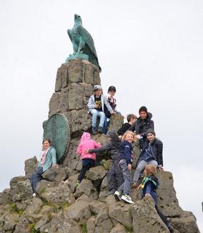 Nach dem Mittagessen in der Märchenwiesenhütte liefen wir dann gemeinsam zum Fliegerdenkmal. Dort angekommen kletterten alle Kinder sofort auf die steinige Statue, die an den 1. Weltkrieg erinnert.
