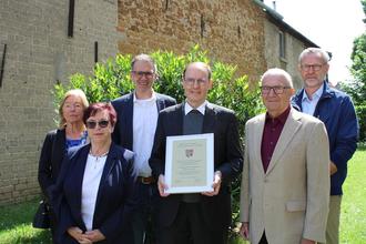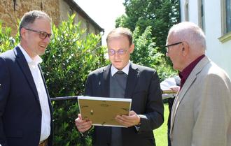 Bei der Verabschiedung von Paul Reder aus Heidenfeld wartete der Vorstand des Historischen Vereins mit einem besonderen Geschenk für den neuen Weihbischof, Dompropst und Bischofsvikar auf: Gemäß seiner Ehrenordnung hat der Vorstand beschlossen, gemäß seiner Ehrenordnung den neuen Weihbischof Reder zu seinem Ehrenmitglied zu ernennen. Nach dem feierlichen und herzlichen Abschiedsgottesdienst konnte ihm beim Empfang die Urkunde mit der Ehrenmitgliedschaft überreicht werden.