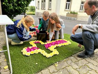 Ein herzliches Dankeschön an „unseren Pfarrer“ Paul Reder! Trotz seines sicherlich vollen Terminkalenders nahm sich der Weihbischof Zeit, um mit den Kommunionkindern Blumenteppiche für Fronleichnam zu legen. In Hirschfeld nahmen Leni, Amy und Lea das Angebot gerne an – Mika war im Urlaub und konnte deswegen nicht dabei sein.
