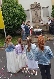 Am Abend begleiteten die Kommunionkinder in Festkleidung die Fronleichnamsfeier und streuten Blumen.
