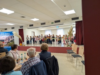 Auf die Begrüßung durch den 1. Bürgermeister Peter Gehring folgte die Eröffnung des Nachmittags mit einer Aufführung der Kindergartenkinder aus Heidenfeld. Mit über 20 Kindern standen sie auf der Bühne und performten mit Gitarrenbegleitung verschiedene Lieder aus vollem Herzen und mit viel Freude. Auch herbstliche Stücke waren dabei, die Kinder hielten dabei bunte Blätter in die Luft und animierten die Seniorinnen und Senioren, die Kleidungsstücke in den verschiedenen Herbstfarben trugen, zum Aufstehen und mitmachen. Ganz lieben Dank an die Kindergartenkinder und die Erzieherinnen für die Vorbereitung und den schönen Auftritt!