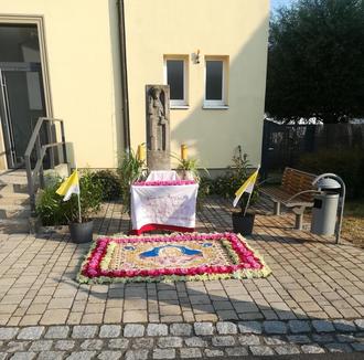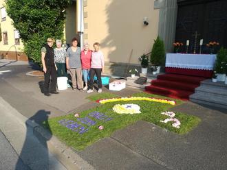 Vielen Dank an die fleißigen Helferinnen, die an Fronleichnam, vor der Kirche und an der St. Jakobus Statue die Blumenteppiche legten und Altäre geschmückt haben.