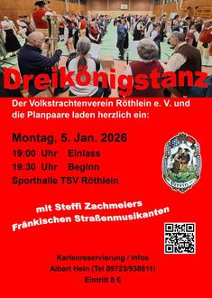 Auch in diesem Jahr organisiert der Volkstrachtenverein Röthlein e. V. zusammen mit seinen Planpaaren am 05.01.2026 den traditionellen Dreikönigstanz in der Sporthalle des TSV Röthlein. Die Besucher, die aus nah und fern anreisen, freuen sich auf einen Abend, an dem man sich ganz den Fränkischen Rundtänzen widmet. Neben der Plantour, die mit Walzer, Schottisch und Rheinländer keine große Herausforderung mehr darstellt, stehen viele Figurentänze auf dem Programm. Hier werden die Schrittfolgen jeweils vor dem Tanz gezeigt, damit alle Tanzinteressierten teilnehmen können und sich dabei möglichst wenig auf die Füße treten. Der Höhepunkt des Abends folgt nach der Pause: bei der Weidenberger Française, eine Parodie auf die steifen höfischen Schreittänze, sucht sich jeder einen Tanzpartner. Denn der Kolonnentanz, bei dem die Figuren während des Tanzes angesagt werden, macht einfach jedem Spaß. Für den musikalischen Rahmen sorgen wieder die Fränkischen Straßenmusikanten, die mit dem ihnen eigenen Charme die traditionelle Volksmusik lebendig werden lassen und ein Garant für gute Stimmung sind.