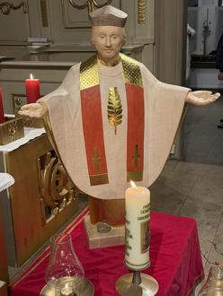 Der Festtag begann mit einer Prozession, die am Kloster Heidenfeld ihren Ausgang nahm. Gemeinsam mit den Schwestern des Klosters, begleitet von den Fahnenabordnungen der Vereine und den Kommunionkindern, wurde die Statue des Seligen Liborius Wagner zur Pfarrkirche getragen – dorthin, wo seine Gebeine ruhen. Diese Prozession war mehr als ein feierlicher Weg: Sie verband Geschichte, Glauben und gelebte Gemeinschaft auf eindrucksvolle Weise.