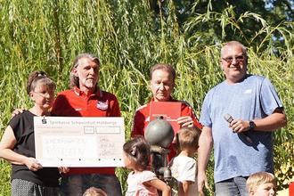 Und zum Schluss gibt es noch eine Überraschung: Der Röthleiner Bayern München Fanclub „Röth’er Zicheuner“ hat im Rahmen seines 40jährigen Vereinsjubiläums in einer Online-Aktion ein Trikot mit den Original Autogrammen der Triple-Sieger der Saison 2019/20 versteigert und binnen einer halben Stunde an den meistbietenden Manfred Ott für 670 Euro versteigert. Und die wurden nun per Scheck vom Vereinsvorsitzenden Bernd Warmuth auf dem Familienfest an den Kindergarten übergeben – eine tolle Summe, über die sich alle sehr gefreut haben und so wurden die großzügigen Spender mit einem dicken Applaus belohnt.