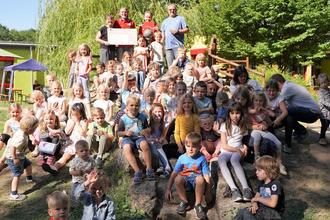 Das Foto zeigt einen Großteil der Kindergartenkinder mit ganz hinten von links: Kindergartenleiterin Katja Bayer, Manfred Ott, Bernd Warmuth und Olaf Patzwaldt vom St. Josef-Trägerverein.