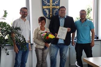 Bild Gemeinde Röthlein, v.l.n.r.: Simon Göbel (Geschäftsleiter), Martina Franke (Jubilarin), 1. Bürgermeister Peter Gehring und Alexander Wächter (Leiter der Finanzverwaltung)