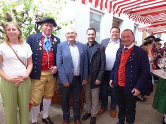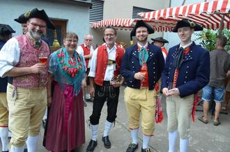 Der abschließende Wettersegen war allerdings, zumindest für die Festveranstalter, nicht sehr hilfreich. Zwar lief der Festbetrieb im Anschluss an, doch viele warteten den Einzug der Röthleiner Planpaare ab. Diese waren ebenso wie mehrere Lokalpolitiker und die Maintalmusikanten aus Hirschfeld Gäste im Genusshof Knaup. Kaum hatten die Trachtenträger mit der Vereinsfahne und den Ehrengästen hinter der Musikkapelle Aufstellung genommen, da schickte der Wettergott schon die ersten Tropfen. Regenschirme boten zwar ein buntes Bild, aber ein Bangen machte sich breit, während der Zug durch die Friedhofstraße zum Festgelände marschierte.