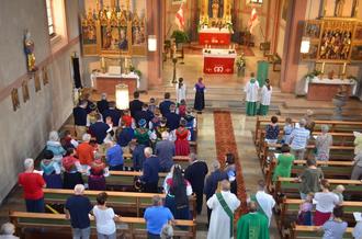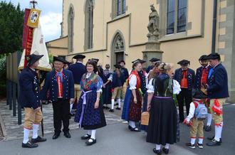 Dann kam der Sonntag und die Mitglieder des Volkstrachtenvereins, Kinder und Erwachsene, füllten zahlreiche Kirchenbänke. Pfarrer Gerhard Pfennig und die beiden Diakone Albert Hein (gleichzeitig Trachtenvereinsvorstand) und Uwe Becker feierten mit den Gläubigen den Festgottesdienst.