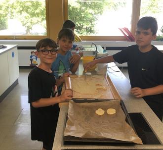 Doch allen wurde schnell klar, dass es bei der Theorie nicht bleiben kann. Zusammen mit der Klassenlehrerin Frau Keßler ging es in die Schulküche. Unter fachlicher Anleitung der ES/WG-Lehrerin Frau Ebner-Federlein wogen die Kinder in Kleingruppen die Zutaten ab, kneteten den Teig und stachen ihn aus. Voller Vorfreude schoben sie das Backblech in den Ofen.