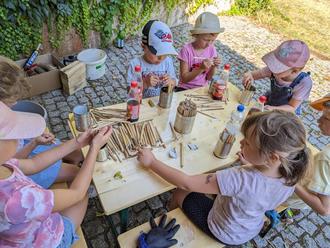 Die Kinder haben außerdem noch fleißig Blechdosen mit Bambusröhrchen befüllt, die jetzt zur Renovierung des Insektenhotels hinter dem Schulgarten verwendet werden können.