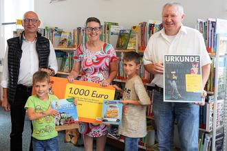 Das Foto zeigt Günther Jira, Alexis Lender und Röthleins zweiten Bürgermeister Martin Weth, sowie zwei eifrige Nutzer der Bücherei bei der offiziellen Übergabe des „Lesezeichens“.