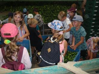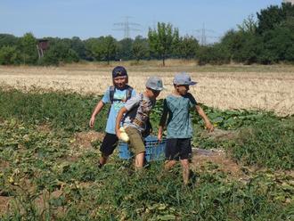 Kaum waren alle Kinder auf dem Bauernhof Knaup angekommen ging es auch schon los. Mit Kleinbussen, Transportern und Sprinter wurden wir auf einen Acker bei Heidenfeld gefahren. Dort sahen wir einen Gurkenflieger und viele Hände, die Gurken pflückten. Matthias erklärte den Kids was das ist. Die Kinder wollten natürlich auch wissen wie es geht. Jede/r bekam eine Kiste und diese konnten sie mit selbstgeplückten Gurken füllen.