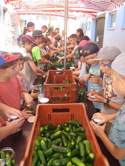 Dort wurden die Gurken in die Sortiermaschine geschüttet, dann in die Waschmaschine, anschließend auf den Tisch. Die Gurkengläser wurden von den Kindern mit den kleinen Gürkchen gefüllt. Noch Gewürze und Sud dazu und verschlossen. Danach wurden sie eingekocht. Bei 80 Grad etwa 10 Minuten.