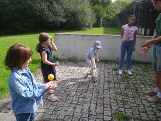 Die Kinder zeigten sich sehr gelehrig und hatten den Bogen bald raus. Der Höhepunkt für uns waren drei Bälle. In der Hand halten und den zweiten Ball auch noch fangen.