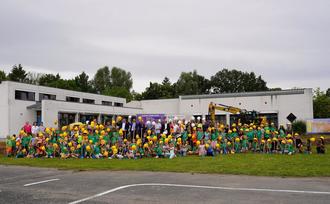 Bob der Baumeister wäre stolz: Gemeinsam stark präsentierten sich die Grundschülerinnen und Grundschüler zusammen mit den Akteuren der Grundschulsanierung; im Bild die Schulfamilie mit Bürgermeister Peter Gehring, Landrat Florian Töpper, Architekt Peter Kopperger, Geschäftsleiter Simon Göbel und Bautechniker Igor Schander, Gemeinderäten, sowie Bauleiter Michael Knappke, Polier Manfred Wegener (Fa.Weeth), Karl Wohlfromm (Ing.-Büro Wohlfromm), Nachhaltigkeitszertifizierer Andreas Schlereth (Change Engineering GmbH).