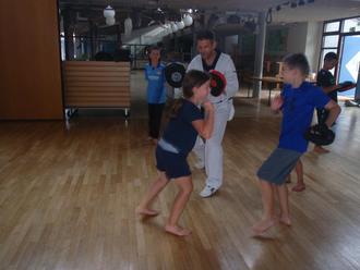 Wir stellten uns im Kreis um Trainer Bernd und nach der Begrüßung mit Verbeugung erklärte er uns die Haltung und die Kampfstellung. Mit Hanna und Dul (eins und zwei) versuchten wir die ersten Schläge und Kicks – alles nur angedeutet – ohne umzufallen.