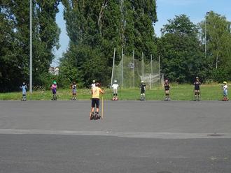 Wir machten uns auf die Suche, die Spuren der Biathleten zu entdecken. Skikes sind wie Skischuhe nur mit Rollen und Skistöcken. Erst mit einem Bein, dann mit beiden fahren, um die Kurve und geradeaus rollen. Dann mit Hilfe der Stöcke schneller vorankommen. Richtig professionell wurde es dann mit Laserwaffe. Die Teilnehmer durften schießen wie die Profis. Das Finale war Staffellauf mit Schießen wie die Biathleten. Es hat allen Spaß gemacht.
