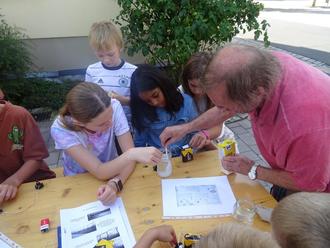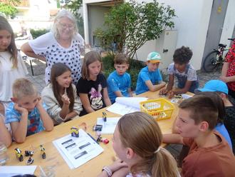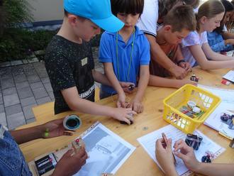 Die Kinder erfuhren einiges zum Thema Strom und durften selbst ausprobieren, was alles Strom leitet. Sie bekamen Batterien, Kabel, Glühlämpchen, Klemmen, Wasser, Salz, Stein, Porzellan usw. und durften Experimentieren. Danach durften sie aus bemalten Gläsern und Photozellen und Glühbirnchene eine hauseigene Photovoltaikanlage bauen.