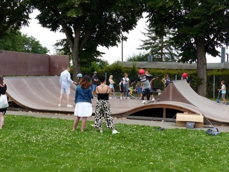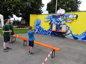 Kreativ wurde gebastelt oder auf dem Skateboard den Anweisungen der Coaches (Back to the Streets) gefolgt. Ein riesiger Fallschirm des Kreisjugendrings lud zum gemeinsamen spielen ein. Geschicklichkeit war am Stand der Diakonie zu beweisen. Im aufgeblasenen Ring der Kampfsportschule Müller, durfte mit einem riesigen Boxhandschuh geboxt werden. Auf Schlauchstücken und Instrumenten des Posaunenchors Sennfeld gab es die Technik des „Posaune spielen“ zu erkunden, das forderte so manchen Teilnehmer heraus und tönte über den Platz.