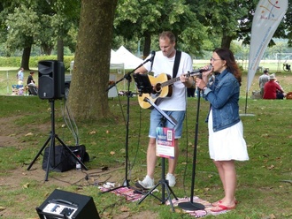 Bereits gleich um 12.00 Uhr tummelten sich auf der Wiese des Sport- und Freizeitgeländes Sennfeld, große und kleine Kinder mit Eltern und/oder Großeltern. Ein reges Treiben auf dem riesigen verkehrsfreien, parkähnlichen Areal. Die Picknickdecken wurden ausgelegt und der Musik „Projekt Wohnzimmer“ (Sandra Zimmermann und Thomas Heege) gelauscht. Die Kinder konnten von Spielstand zu Spielstand flitzen, am Glücksrad der KOJA drehen und die vielfältigen Stände erkunden.