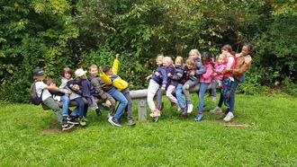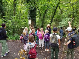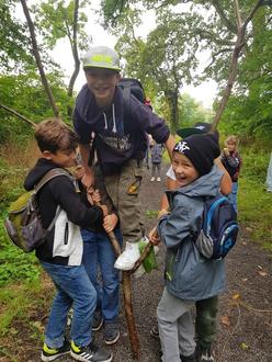 Mit Rucksack und Wanderausrüstung ging es an der Bibliothek los zum Spielplatz am Tännle. Dort wurde gespielt, getrunken und der erste Teil vom Räuber Hotzenplotz vorgelesen. Weiter durch die Friedhofstraße zum nächsten Spielplatz vor dem Wald. Spiele wie „Wer hat Angst vor dem weißen Hai“; „Fischer welche Fahne weht“; „Ochs am Berg“ wurden zusammen gespielt. Nach der Stärkung gab es den zweiten Teil vom Räuber. Und die nächste Etappe wurde in Angriff genommen. Am Eingang vom Wald war der dritte Teil der Geschichte dran. Danach wurden Blätter von Bäumen gesucht und bestimmt. Weiter ging es zum sagenumwobenen schwarzen Loch. Die Sagen die vor langer Zeit entstanden sind wurden erzählt und die Kinder wollten hören „warum sind die versunken und warum ist da immer Wasser drin“ usw. Auf dem Rückweg wurden noch Stecken gesucht, geschnitzt und verschönert.
