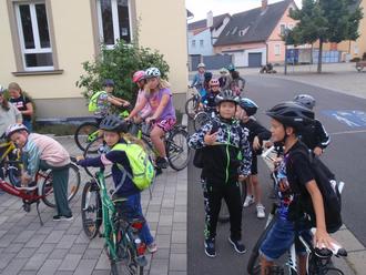 Wir trafen uns an der Bücherei und fuhren über die Makadam nach Schwebheim zum Tierheim. Hintereinander, mit Helm und verkehrstüchtigem Fahrrad, mit zwei Erwachsenen ging es los. (Die Autofahrer wurden in Schwebheim von Bernhard erwartet).
