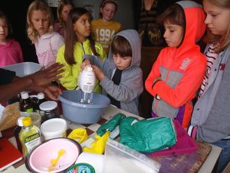 Alle durften messen, rühren, mischen und fühlen. (Die Lauge reagierte und wurde dabei heiß.) Dann wurden noch Lebensmittelfarbstoffe und Düfte untergemischt, damit auch alles gut aussah.