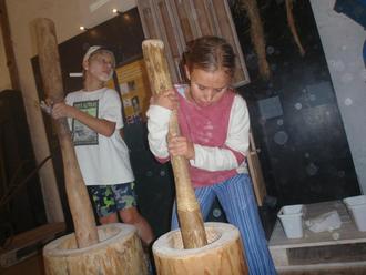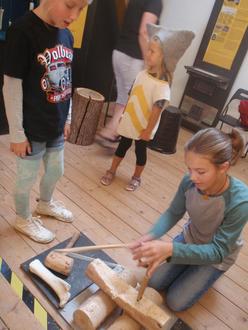 Wie kamen die Menschen zur damaligen Zeit auf die Idee dort eine Siedlung zu errichten und warum gaben sie diese nach 150 Jahren wieder auf und zogen nur ein kleines Stück weiter, um sich dort nieder zulassen. Danach wurden wir durch die Sammlung geführt und die Kinder waren sehr aufmerksam. Sie durften die nach Funden rekonstruierte Kleidung anziehen und hantierten mit den Gerätschaften.