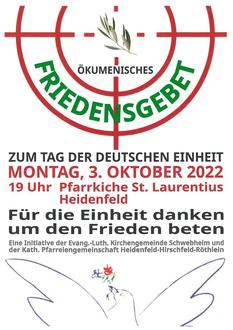 | 19.00 Uhr | Ökumenisches Friedensgebet zum Tag der Deutschen Einheit in der Pfarrkirche St. Laurentius Heidenfeld |