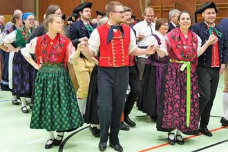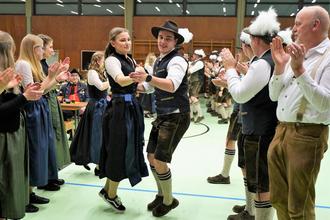 Weiter ging es im Programm mit vielen verschiedenen Plantouren, moderiert von Gau-Vortänzer Florian Kress und umschwirrt von Fledermäusen, die aktuell mal wieder in der Turnhalle residieren. Stets ordentlich notiert auf einem blechernen Schild am Bühnenrand stellten die Standard-Rundtänze wie Walzer, Rheinländer, Schottisch oder der rasante Dreher keine allzu großen Herausforderungen an die Tanzenden, wohl aber die um einiges schwierigeren Figurentänze Stampfer, Schlamperer oder Bauernpolka mit ihren komplizierten Schrittfolgen, die wie gewohnt von den Röthleiner Planpaaren erstmal vorgetanzt wurden.