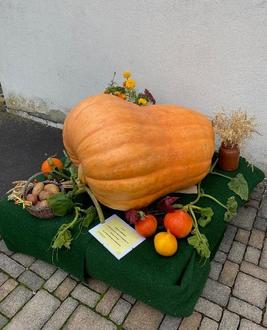 Wieviel Arbeit das Züchten eines solchen Riesenkürbisses beinhaltet, erklärten die beiden Initiatoren. Angefangen beim Aussuchen des richtigen Saatguts, der aufwendigen Pflege, beim Ausgeizen der Blüten, der richtigen Behandlung des Kürbisblätterwalds und natürlich, trotz unseres regennassen Sommers, das ständige Gießen und natürlich auch Düngen, das alles brauchte es um erfolgreich zu sein. Heraus kam dabei: der dicke Hermann für das Erntedankfest in Hirschfeld. Eine schöne Idee!