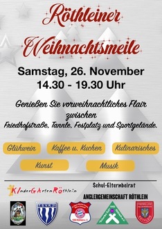 Die 1. Röthleiner Weihnachtsmeile findet am 1. Adventssamstag (26. November) von 14.30 - 19.30 Uhr statt. Entlang der Friedhofstraße, vorbei am Tannle, über den Festplatz bis hin zum TSV-Sportgelände werden die teilnehmenden Vereine Stationen aufbauen, an denen sich jeweils zahlreiche Schausteller mit einem interessanten und reichhaltigen Angebot präsentieren werden. Für die musikalische Umrahmung ist bestens gesorgt. Als Höhepunkt wird auch der Nikolaus vorbei schauen.