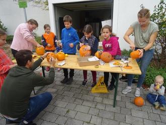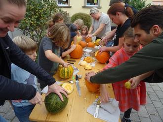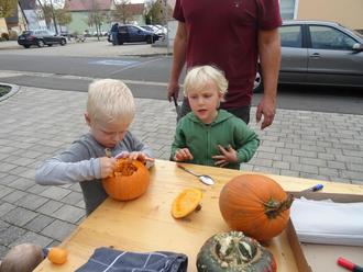 Unterhaltungswert für Eltern hoch, Spielwert bei den Kids höher. Die Kleinen malten mit Kreidefilzstiften und Edding Gesichter auf die kleineren Kürbisse. Jeder durfte sein Kunstwerk mit nach Hause nehmen.