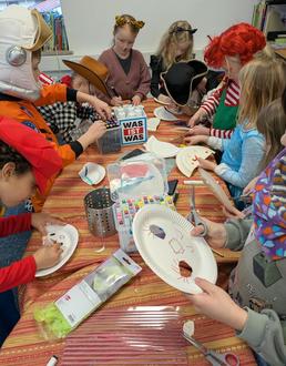 Die Kinder kamen verkleidet und hörten die Geschichte mit Wonne. Anschließend durfte jedes Kind Masken basteln, zum Aufsetzen oder als Deko für die Zimmerwand, mit Glitzer oder bunt angemalt.