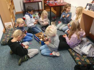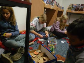 Die Kinder hörten zu, erzählten ihre eigenen Erlebnisse mit z.B. dem Nikolaus oder vom Schnee, und bastelten aus Zapfen und Holzabscheiben, Bäume die sie noch bemalten, zum Mitnehmen. Als Schmuck am Kellerfenster o.ä…….